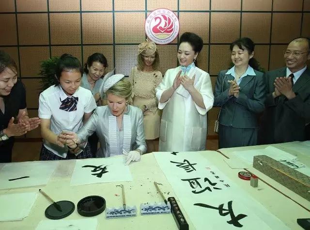 两位夫人驻足观看孩子们的书法作品。“厚德载物”,写得俊秀;“友谊长青”,苍劲有力。王后收到邀请,书写“友”字。一笔一划、一撇一捺,她格外认真。