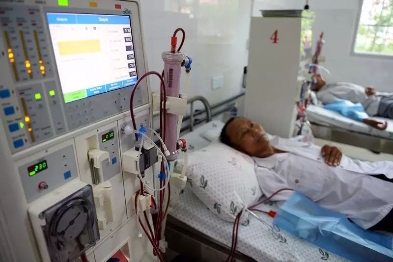 ↑2014年8月1日,在江西省于都县禾丰镇中心卫生院,患者在血透室接受免费血液透析。新华社陈子夏摄