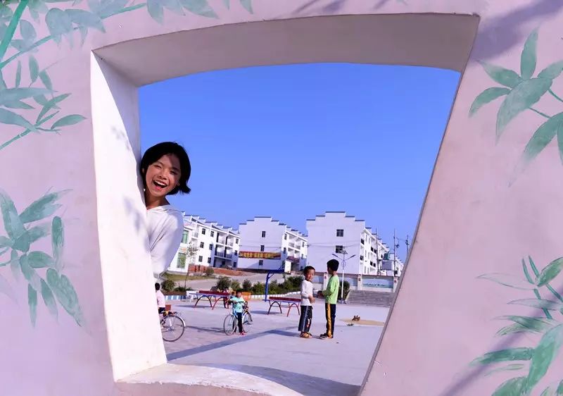 ↑2014年10月18日,在于都县禾丰镇大字小西湖社区扶贫安置点,孩子们在娱乐广场上玩耍。新华社记者陈子夏摄