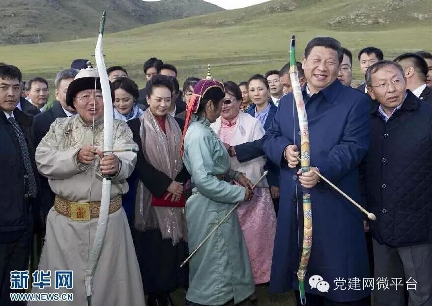 2014年8月22日,国家主席习近平在蒙古国总统额勒贝格道尔吉陪同下前往乌兰巴托市郊观看那达慕。这是习近平与额勒贝格道尔吉一起弯弓搭箭。