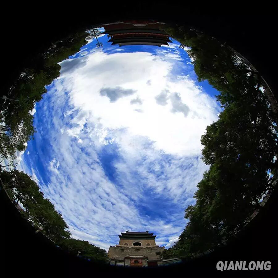 6月11日,鱼眼镜头“小星球”效果下的美丽北京,上为鼓楼,下为钟楼。千龙网记者 王璟玥摄
