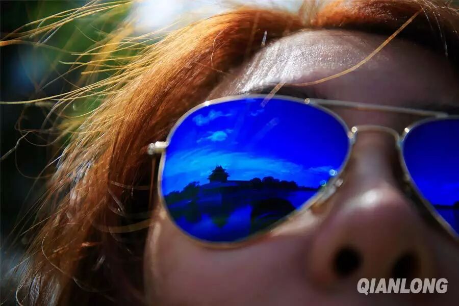 6月11日,角楼与蓝天映在故宫外游客的太阳镜上。千龙网实习记者 韩继伟摄