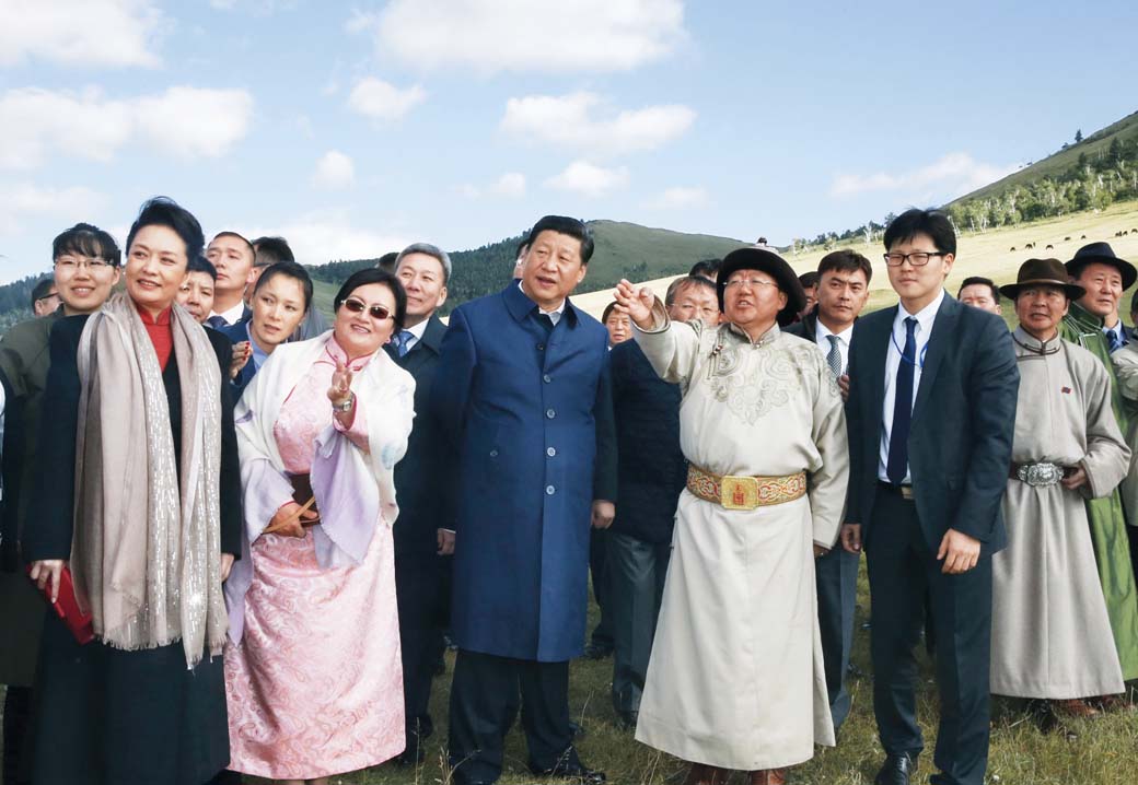 2014 年 8 月 22 日,习近平和夫人彭丽媛同蒙古国总统额勒贝格道尔吉夫妇观看表演