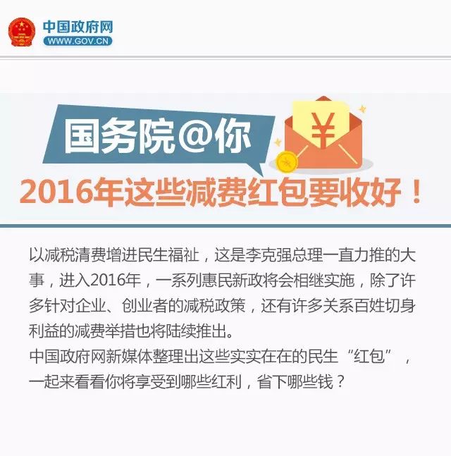 国务院@你,2016年这些减费红包要收好!