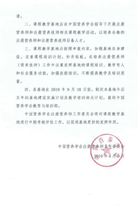 中国营养学会依据《中国科协所属学会有序承接政府转移职能扩大试点工作实施方案》、《中国科学技术协会章程》、《中国营养学会章程》等有关文件,为加强注册营养师人才队伍建设,加快规范化培养的进程,在2019年5月组织开展了第二次注册营养师课程教学基地申报工作。经单位申报、逐级审核、注册营养师工作委员会专家终审,确定批准中南大学、中国医科大学、贵州医科大学等11所院校为注册营养师课程教学基地,有效期5年(即2019年6月—2024年6月)。