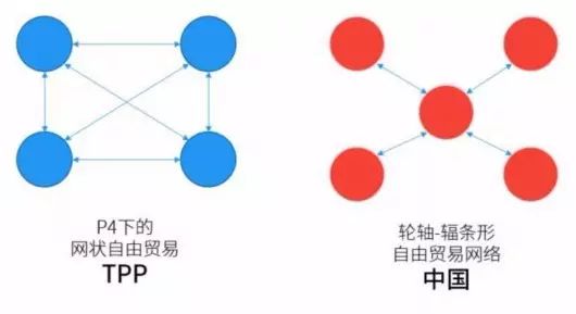 除此之外,中国在外部战场也并非无用武之地。TPP是一个网状结构,每一个成员国都要对其他11个国家采取零关税政策。换而言之,在这套体系当中,一共有66组双边关系。中国虽然还不在这个网状结构当中,但完全可以与相关国家分别签署自贸协定,从而 形成一个以中国为中心,辐射各个签署国的轮轴-辐条 (Hub and Spokes)形FTA网络。