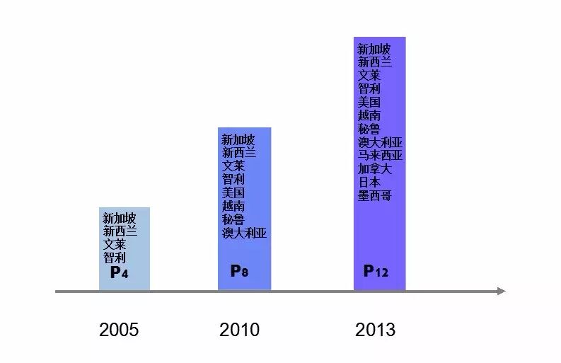 2008年,美国高调宣布加入TPP协议谈判,秘鲁、越南和澳大利亚紧跟美国,在2010年3月15日正式启动了TPP协议的谈判。至此,“P4”升级成了“P8”。而在之后的两三年中,加拿大、墨西哥、日本、马来西亚相继加入协议谈判,“P8”又升级成了“P12”。