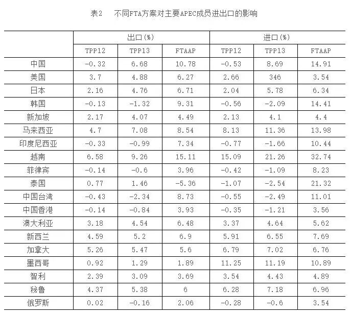 表格中的P13是假设中国加入TPP后的测算结果,FTAAP则是在“亚太自由贸易区”(Free Trade Area of the Asia-Pacific)模式下的测算结果。由测算结果可见,不论TPP还是FTAPP,区域自由贸易协定都会对中国的进出口和GDP产生明显提振作用。